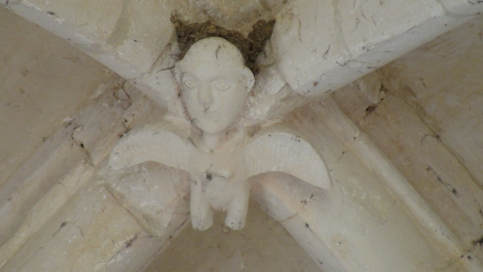 Dans l’église on trouve également une peinture murale (croix de consécration) datant des 14ème ou 15ème siècles. Une des clefs de voûte représente une tête humaine stylisée entourée de feuillage.
