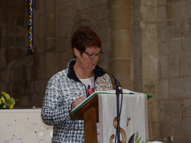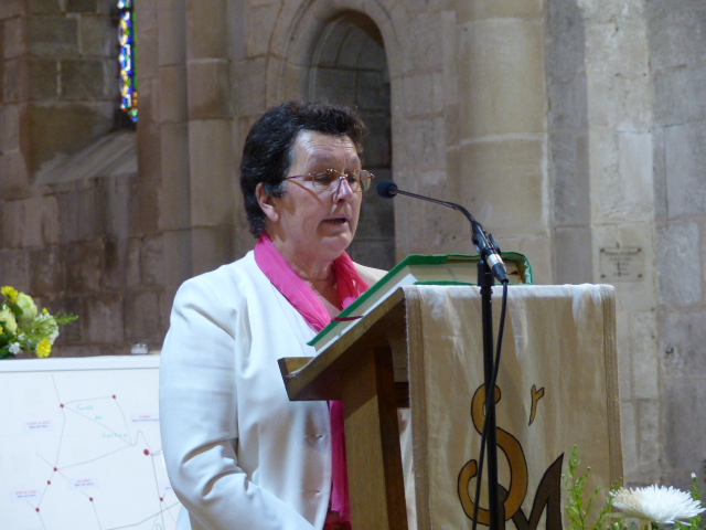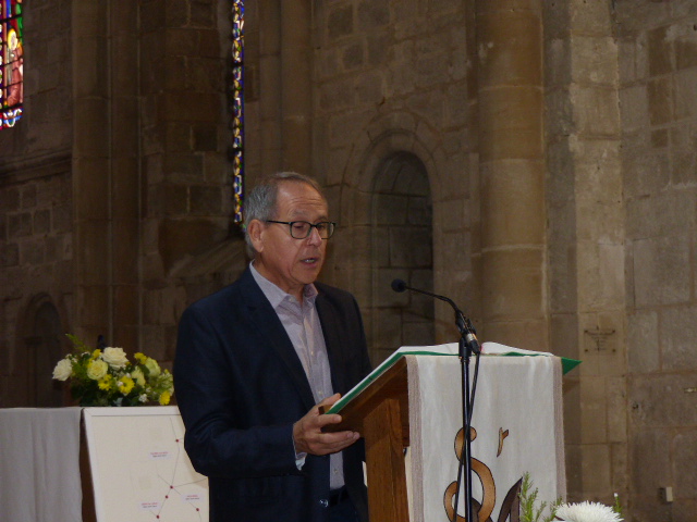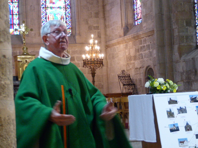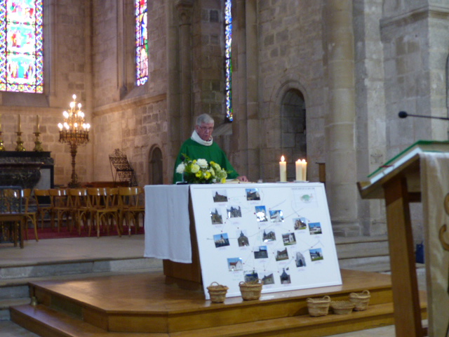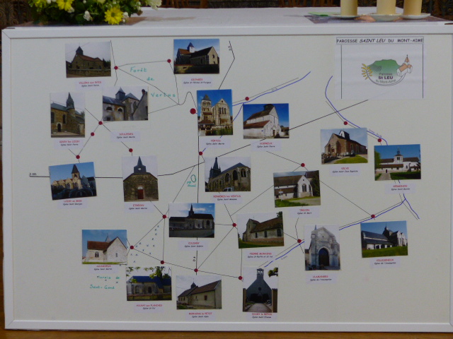A l’offertoire, à la suite des 7 enfants de chœur, une photo de chacune des 20 églises de la paroisse du Mont Aimé a été apposée sur un fond de carte dressé face à l’autel, un des symboles de son action.