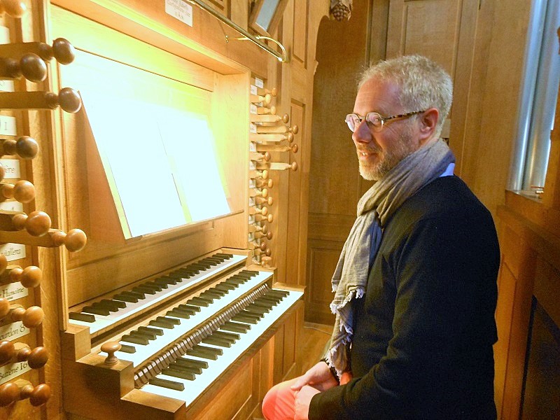 Précisons que Mickaël Gaborieau, natif de Toulouse, est professeur à l’académie de musique et d’arts sacrés de Sainte-Anne d’Auray, dans le Morbihan. Cette petite ville est célèbre pour son pèlerinage dédié à Sainte Anne. Mickaël Gaborieau est concertiste, donne de nombreuses représentations en France et à l’étranger, il est titulaire du grand orgue de la basilique Sainte Anne d’Auray, voir photo ci-après.