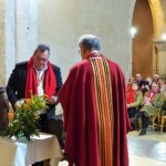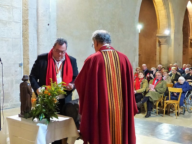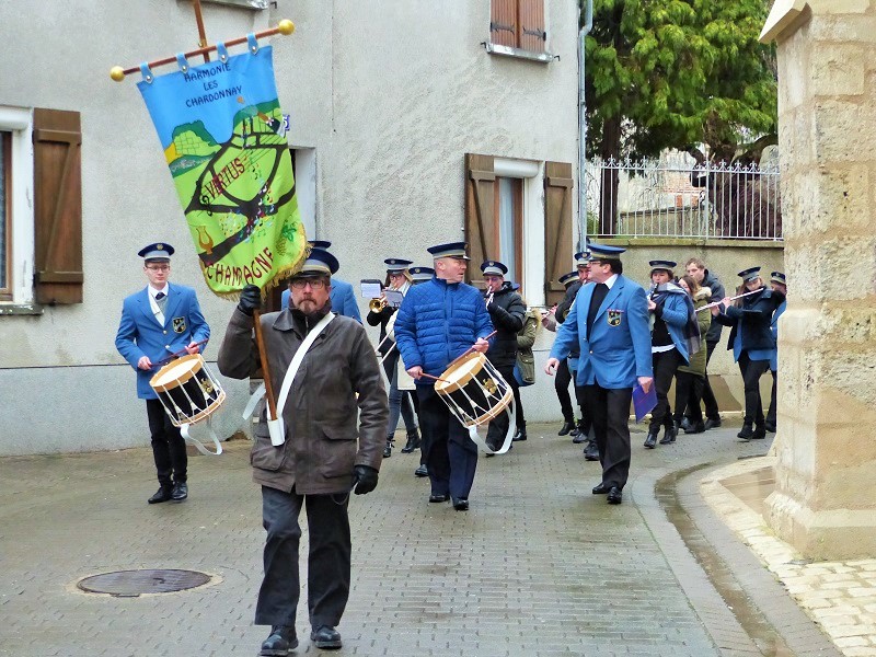 Bannière en tête, le cortège qui a précédé la cérémonie, s’est déplacé sous une pluie froide et persistante dans les rues de Vertus, mais les vignerons ont l’habitude de ne pas reculer devant l’advesité d’une météo bien désagréable en ce 20 janvier. Pour une question de répartition avec les autres communes du vignoble, cette fête à eu lieu quelques jours avant la date officielle, mais à s’entendre dire que le Saint Patron des vignerons ne porte jamais rancune de cette situation. Maxime Toubart, président du Syndicat Général des Vignerons de la Champagne était l’invité d’honneur de cette grande fête des vignerons. La chorale paroissiale, conduite par Marie-Claire Mangeot était bien sûr de la partie, accompagnée par Jean-Marie Rutat au grand orgue. L’harmonie municipale menée par Vincent Boutillier, professeur de musique a fait a fait vibrer les murs de l’église, mais aussi les cœurs. Toujours dans le respect de la tradition, après la bénédiction du pain et du vin, les bâtons de Saint Vincent on été échangés pour un an entre les anciens et les nouveaux récipiendaires et devant les fidèles qui ont eux aussi accompagné cette fête par un cantique « Ô grand Saint Vincent ».